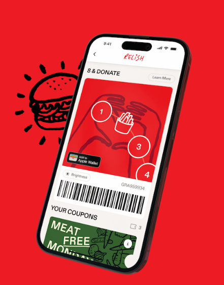 The design decision that sets Relish apart is what happens at the 8th visit. Rather than simply redeeming the free burger, the member can choose to donate the cost of a meal to St Vincent de Paul (Vinnies) instead. This gives the program a charitable redemption path that converts individual reward equity into brand goodwill and community outcomes.