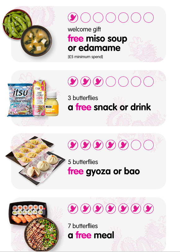 UK-based pan-Asian food chain itsu runs a digital stamp card program in which members collect butterflies, one per order of £5 or more, through the itsu app. Rewards are triggered at the 3rd, 5th, and 7th butterfly, plus a sign-up welcome gift and birthday treats.