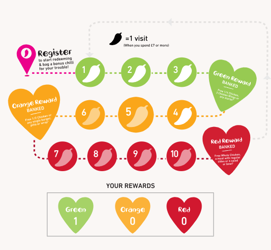 Nando’s UK operates a digital stamp card called Chillies. New members receive a bonus Chilli on registration, and from there earn one Chilli for every order of £7 or more, whether they eat in, collect, or order delivery. Rewards are banded: 3 Chillies unlock a Green Reward, 6 Chillies unlock an Orange Reward and 10 Chillies unlock a Red Reward, with all rewards expiring one year after issue.