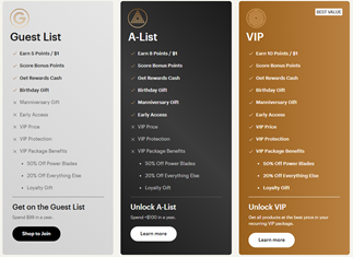 - VIP: Exclusive to subscribers. Earn 10 points per $1, receive 50% off power blades, 20% off all other subscription box items, extended warranties, free samples, and annual loyalty gifts