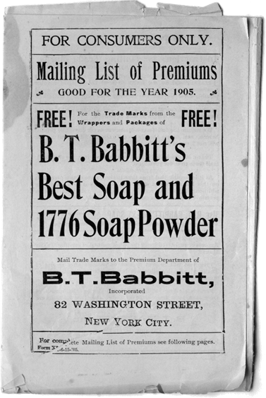 The Profit Share Plan also cautions, ‘When you buy all B.T. Babbitt’s Products, consisting of Soaps, Cleanser, ‘1776’ Soap Powder, and Pure Lye or Potash, you are entitled to a return in the form of a premium. If you do not save the trade marks from any of the Babbitt articles you are losing just so much. These trade marks are worth fully one-half cent each to you if redeemed from our premiums.’