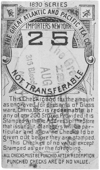 In the 1860s, the Great Atlantic & Pacific Tea Co. (which was set to become the largest retailer in the world under the A&P brand between the 1920s and 1960s)[14] launched a comparable program to reward their customers for purchasing a selection of their products. When transacting, customers would receive a red coupon known as a ‘check’, detailing the amount it was worth and the terms. One 1890 example states, ‘This Check (good for the amount as engraved for presents of Glass ware, China, etc.) is redeemable at any of our 200 Stores. Provided it is Stamped with the Address of the Store that issued it. Managers will be particular and allow no Checks to be given out before they are stamped. This Check is of no value except Stamped as per the foregoing. ALL CHECKS MUST BE PUNCHED AFTER REDEMPTION. PUNCHED CHECKS ARE OF NO VALUE.’[15]