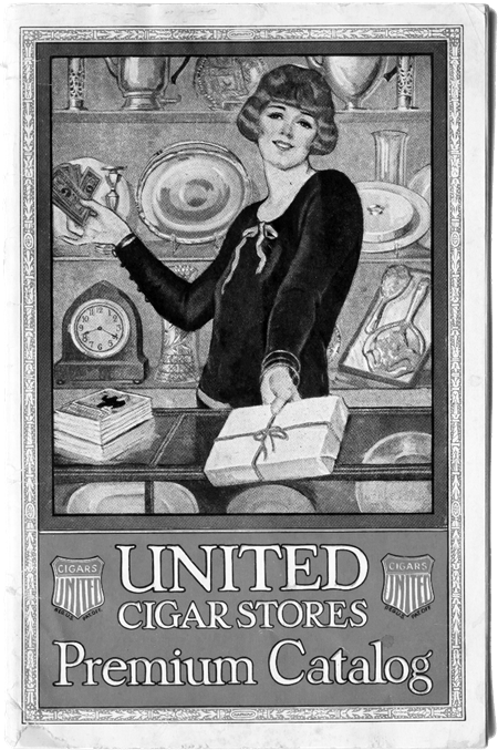 The United Cigars Store Co 1924 Premium Catalog[31] features a selection of well over one thousand reward items, including clothing, umbrellas, smoking accessories, razors, cutlery, leather goods, toiletries, jewellery, clocks, watches, kitchenware, headphones, cameras, sporting goods, toys, games and silverware.